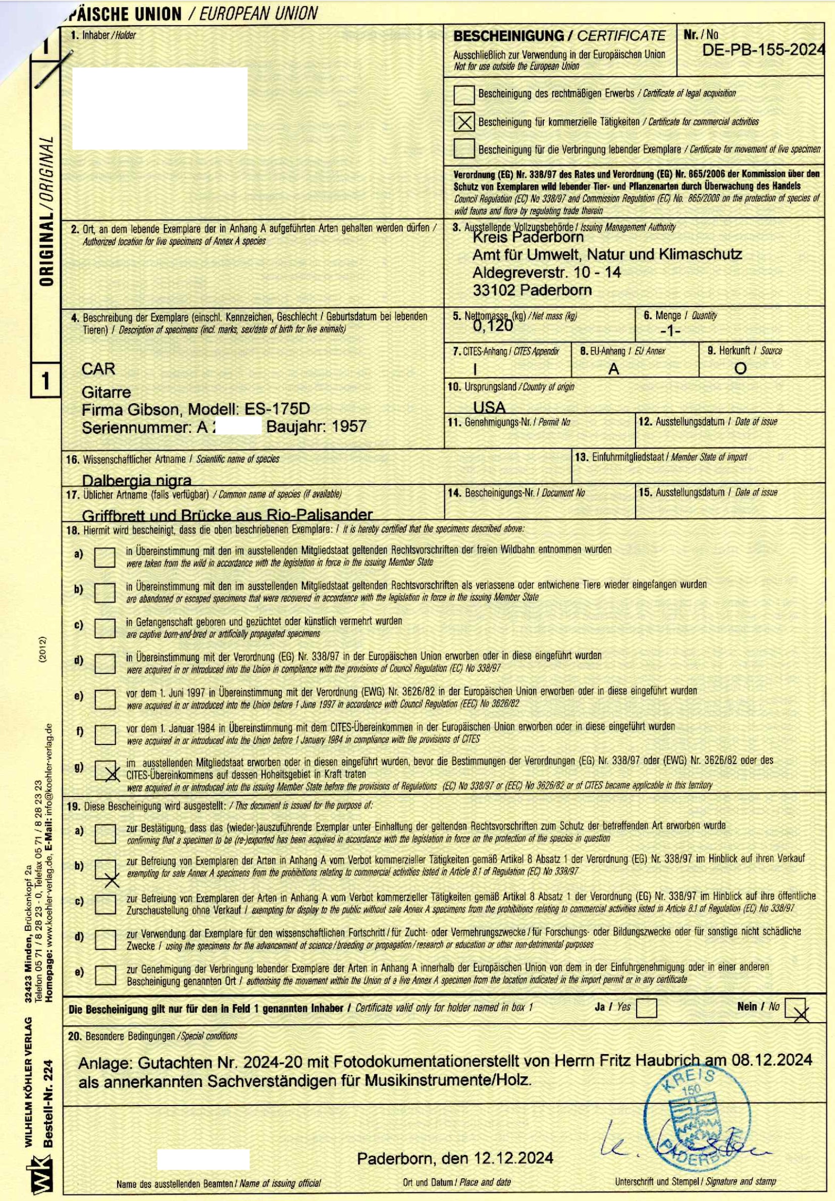 2) Es ist ein Gutachten beizubringen, welches belegt, das dass Instrument tatsächlich vor diesem Datum gebaut wurde und Dalbergia Nigra verbaut ist.