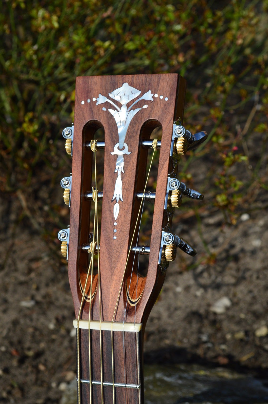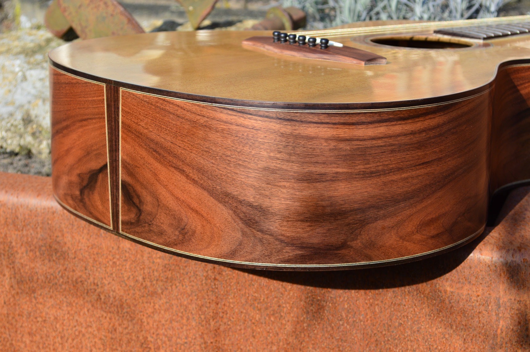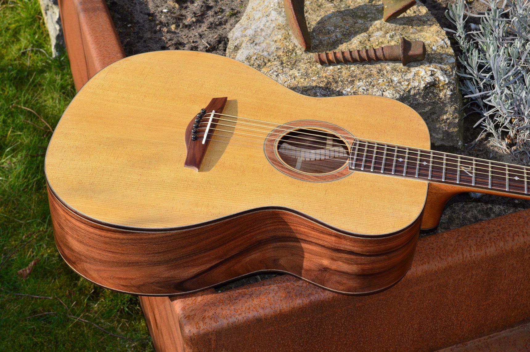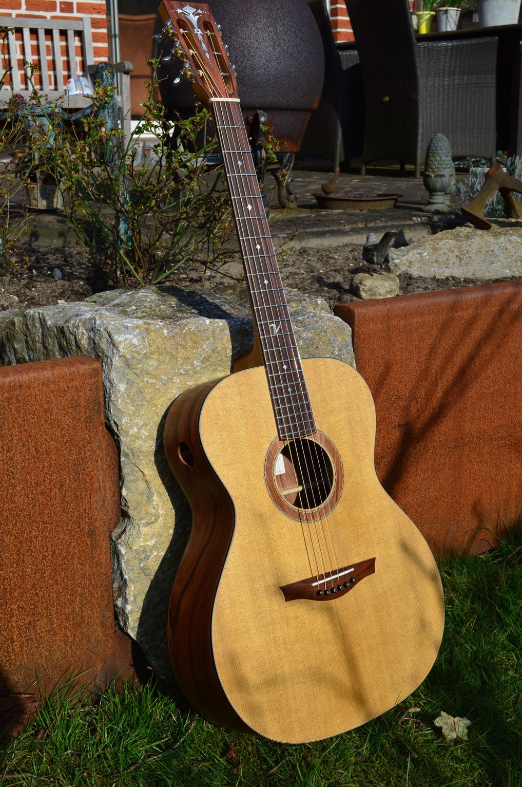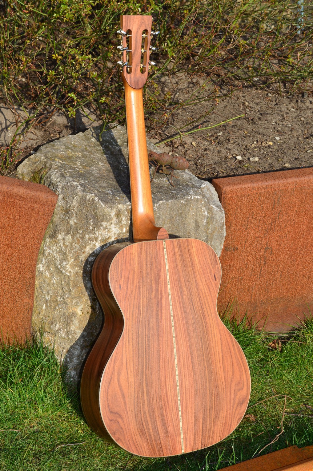 Eine custom built OM/OOO mit extra tiefem Korpus von 118 auf 98 mm. Das Besondere hier ist zudem ein sogenannter Soundport - ein „Loch“ in der Zarge, durch das die Gitarre direkter und für das Ohr des Spielers offener und transparenter klingt. Der Hals wurde aus 40 Jahre altem Mahagoni gefertigt. Der Korpus, das Griffbrett, die Brücke und die Kopfplattenfurniere bestehen aus Pao Ferro. Die Decke ist aus „gebackener“ Fichte. Beim „backen“ wird das Holz unter Sauerstoffausschluss extrem erhitzt, sodass es normaler Weise verbrennen würde. Die Decke ist dadurch künstlich gealtert. Die Intarsien sind aus Perlmutt.