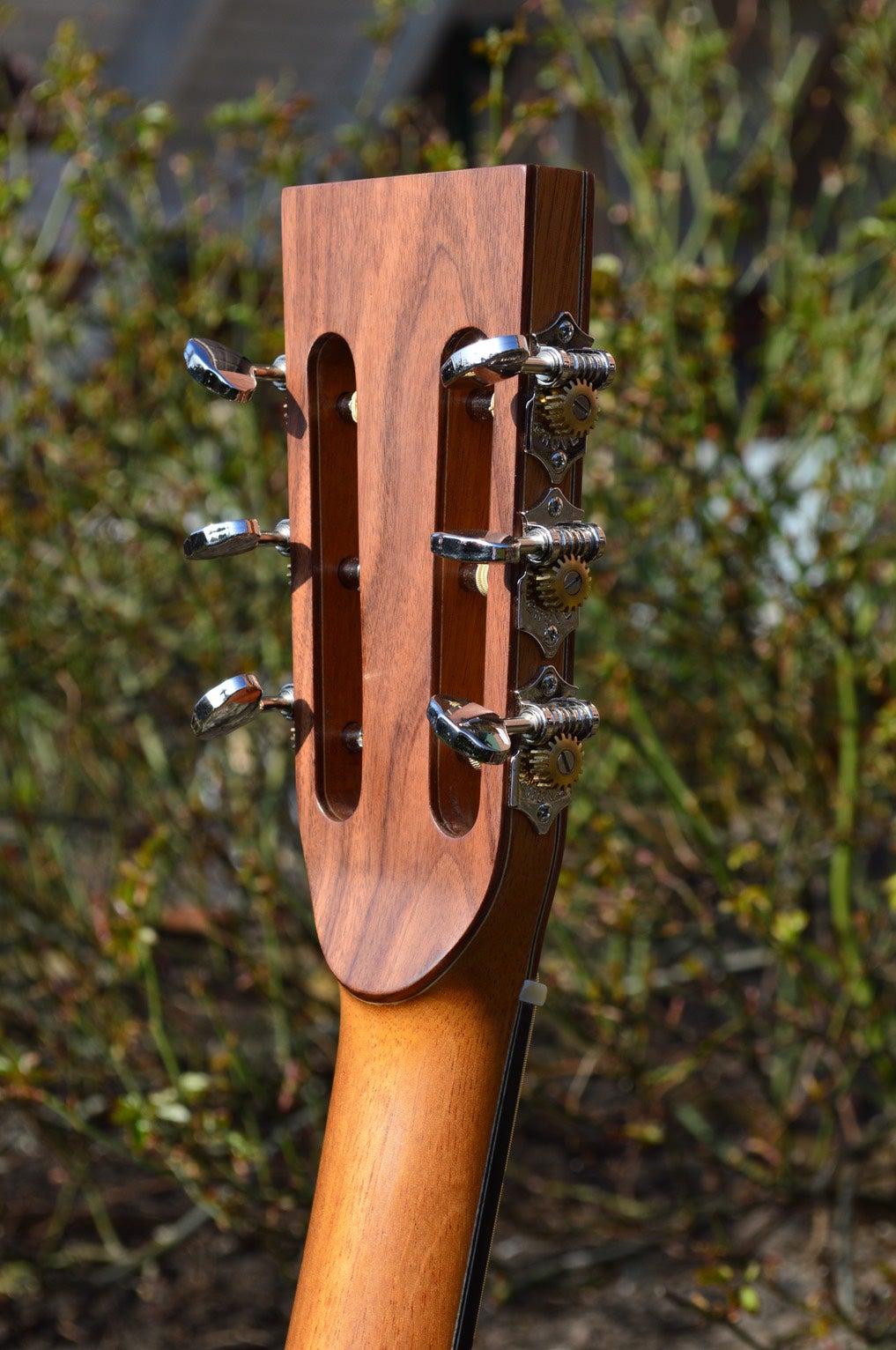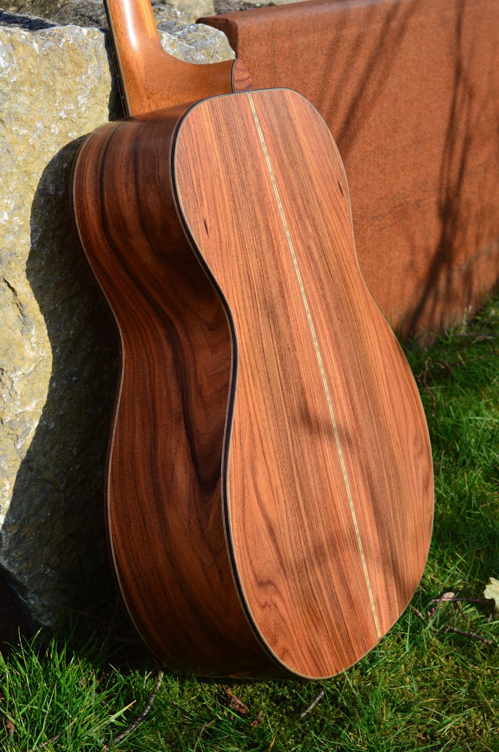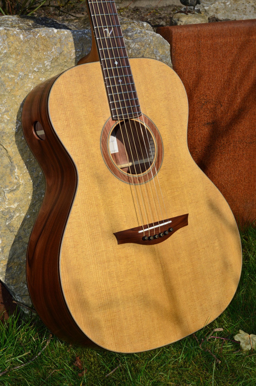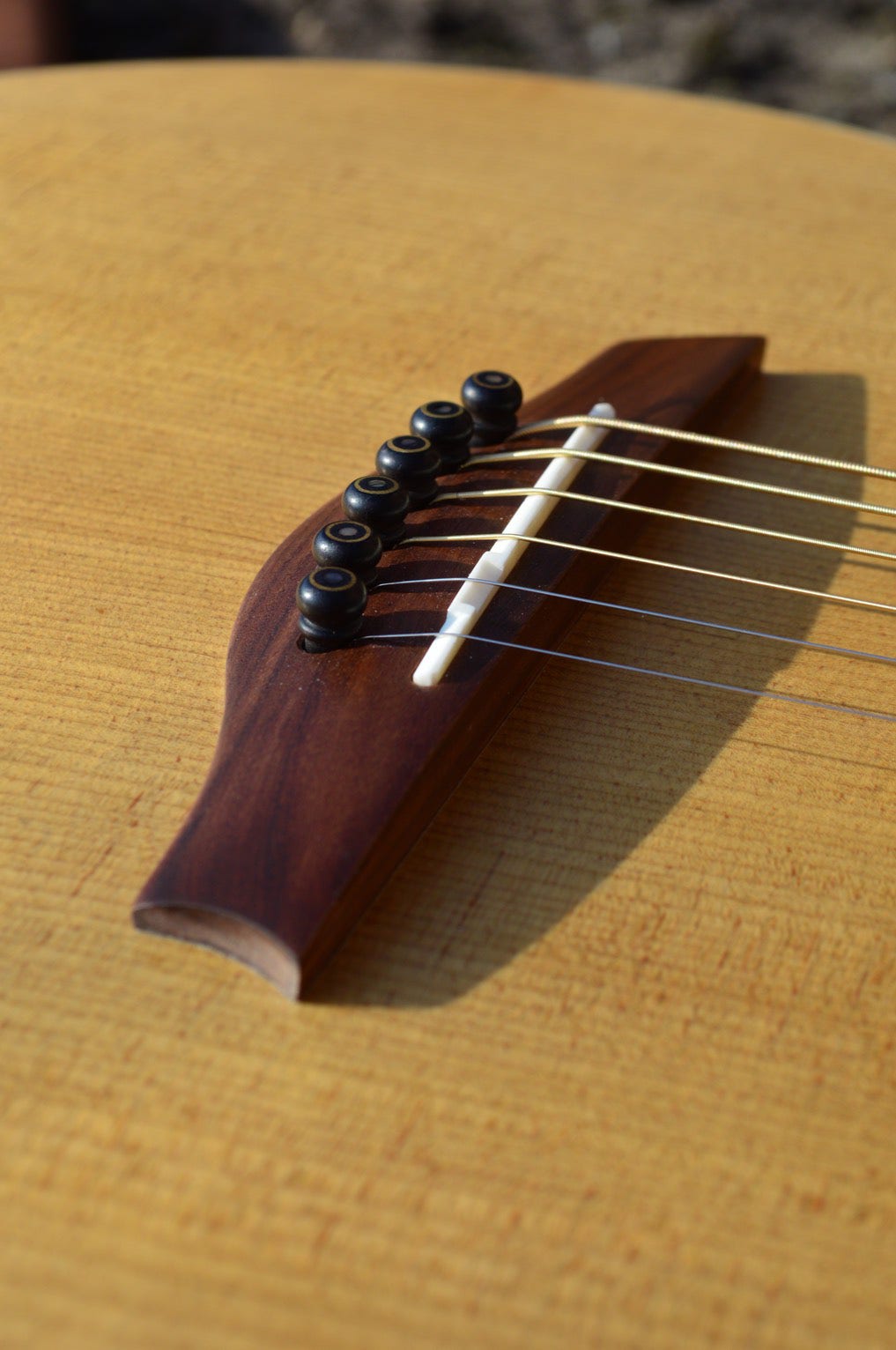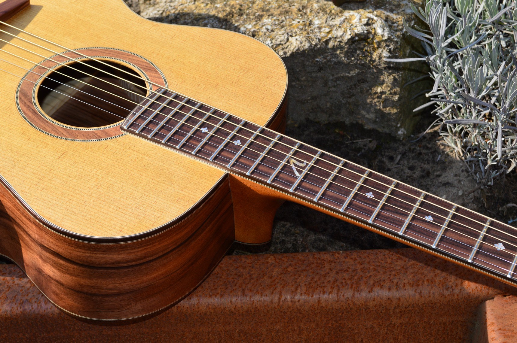 Eine custom built OM/OOO mit extra tiefem Korpus von 118 auf 98 mm. Das Besondere hier ist zudem ein sogenannter Soundport - ein „Loch“ in der Zarge, durch das die Gitarre direkter und für das Ohr des Spielers offener und transparenter klingt. Der Hals wurde aus 40 Jahre altem Mahagoni gefertigt. Der Korpus, das Griffbrett, die Brücke und die Kopfplattenfurniere bestehen aus Pao Ferro. Die Decke ist aus „gebackener“ Fichte. Beim „backen“ wird das Holz unter Sauerstoffausschluss extrem erhitzt, sodass es normaler Weise verbrennen würde. Die Decke ist dadurch künstlich gealtert. Die Intarsien sind aus Perlmutt.