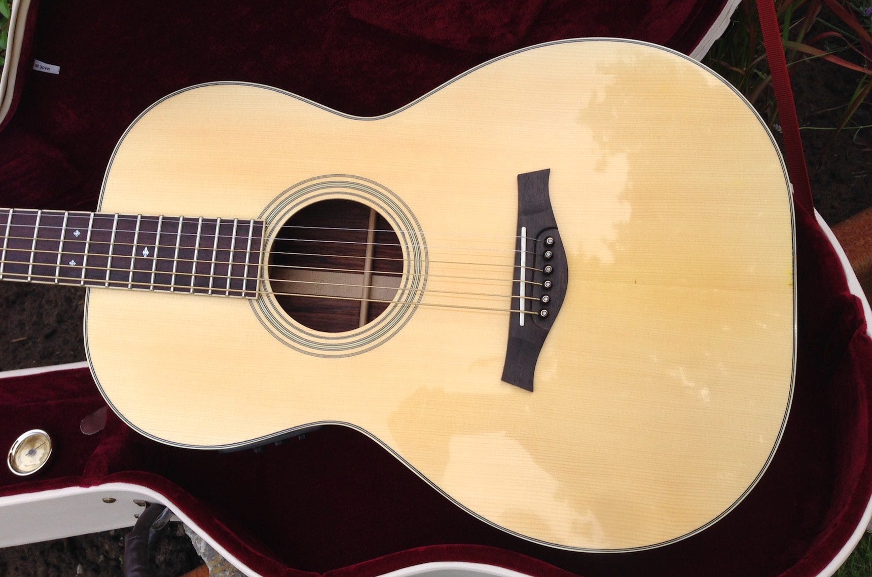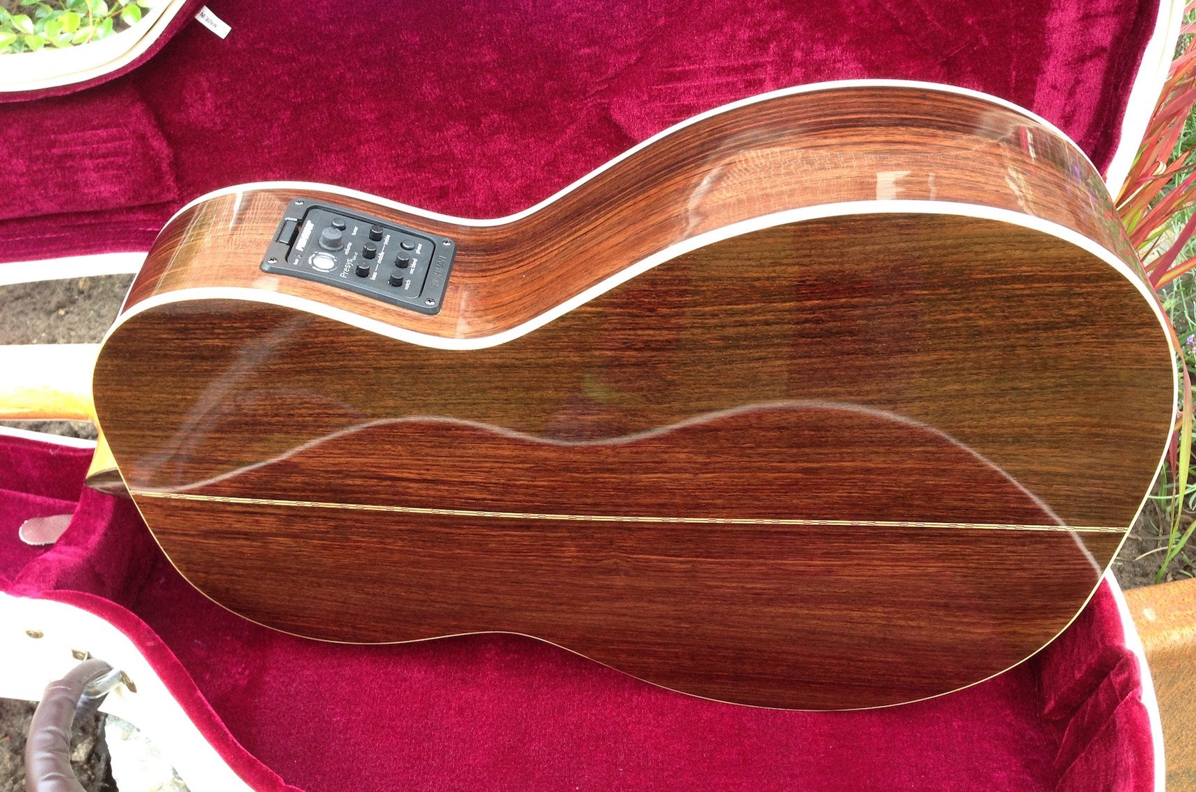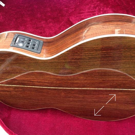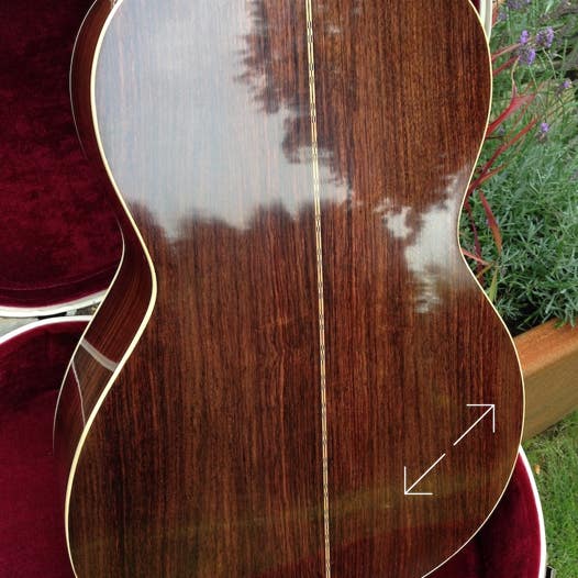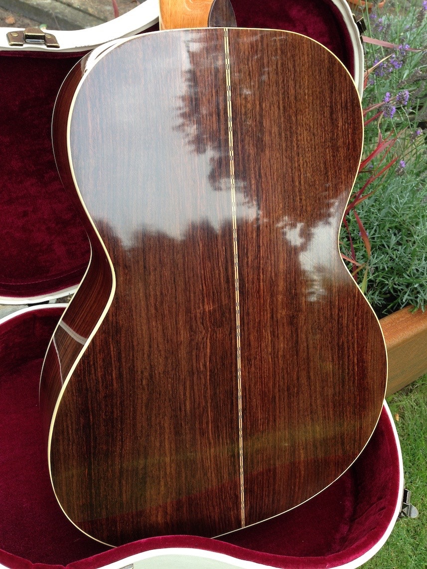 Für den Korpus dieser Gitarre wurde ausgesuchter Ostindischen Palisander gewählt, für die Decke eine Bosnische Fichte und der Hals wurde aus Honduras Mahagoni gefertigt. Das Griffbrett ist ebenfalls aus Ostindischem Palisander.Bei dieser Gitarre wurde der Schelllack sehr dick aufgebracht, was zu einem extremen Glanz führt.