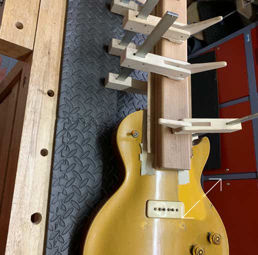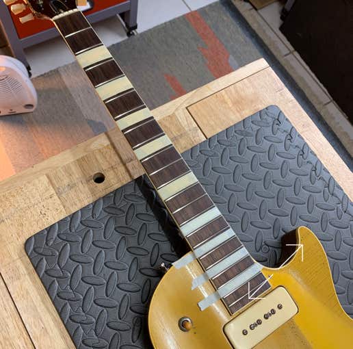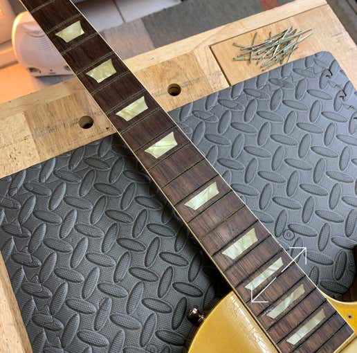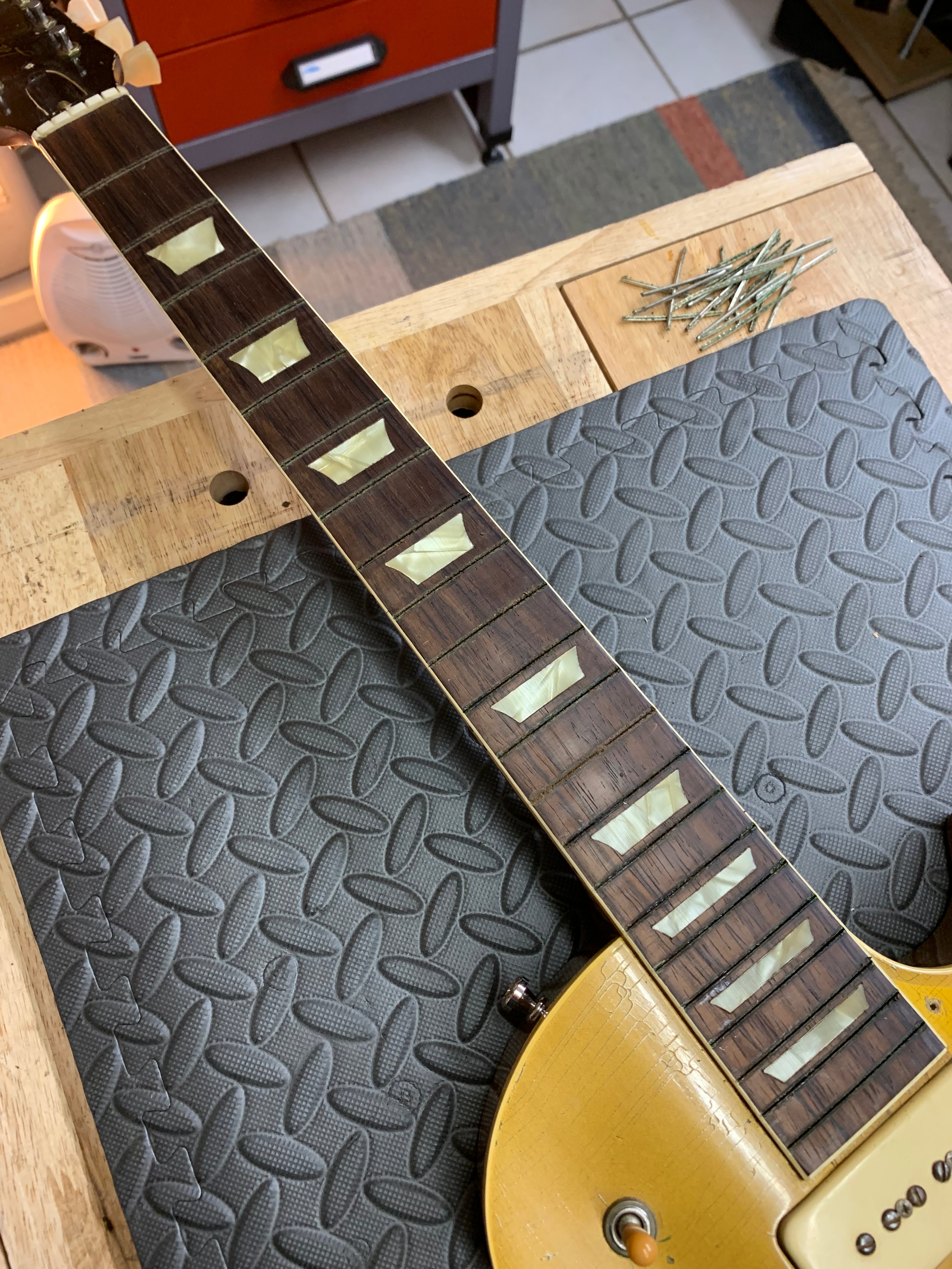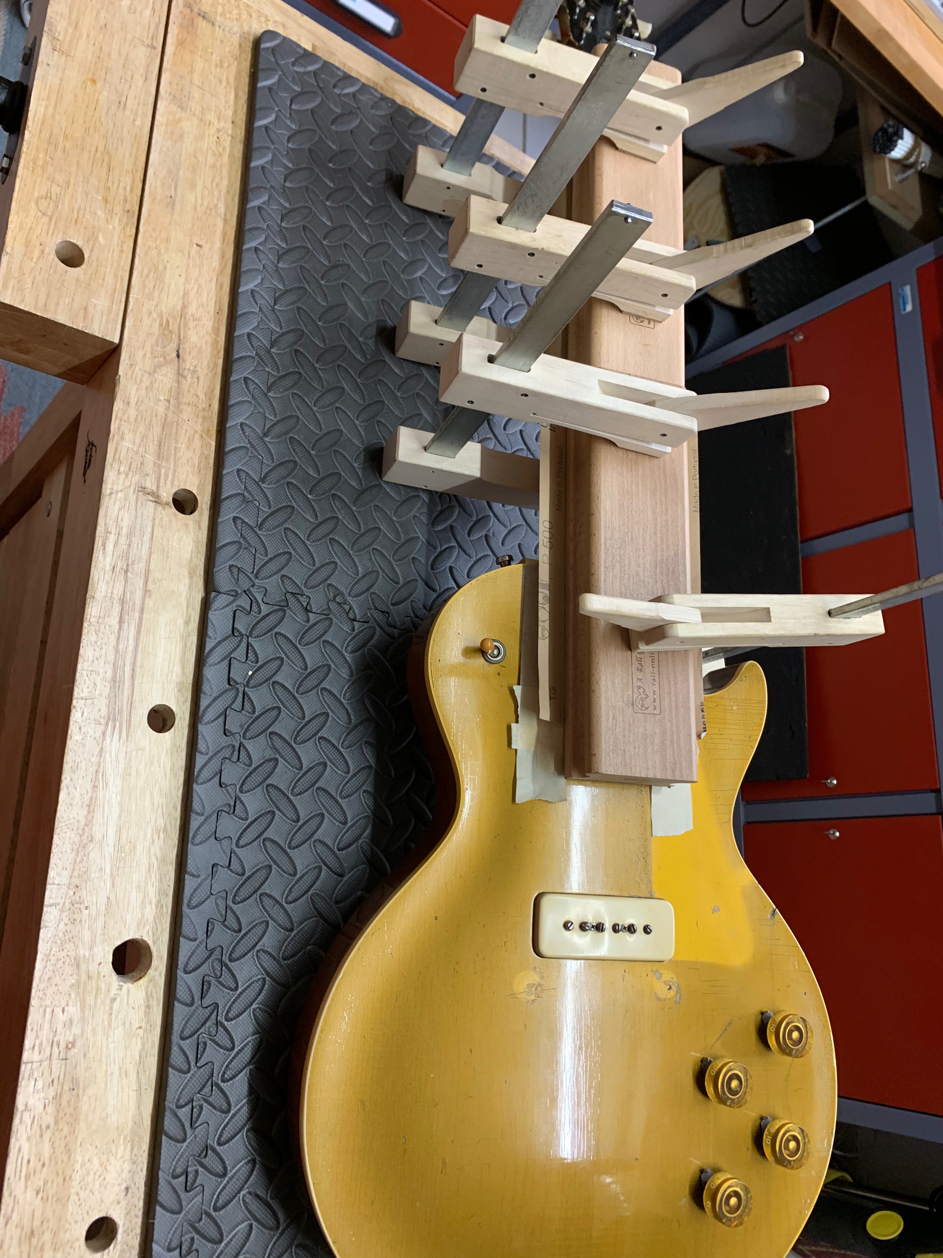 Die runtergespielten Bünde sollten ersetzt und die wirklich unvorteilhafte Brücke gegen eine moderne „wrap-over“-Brücke ausgetauscht werden.