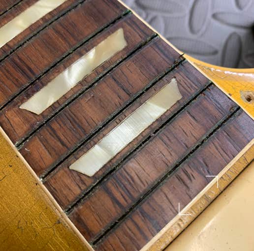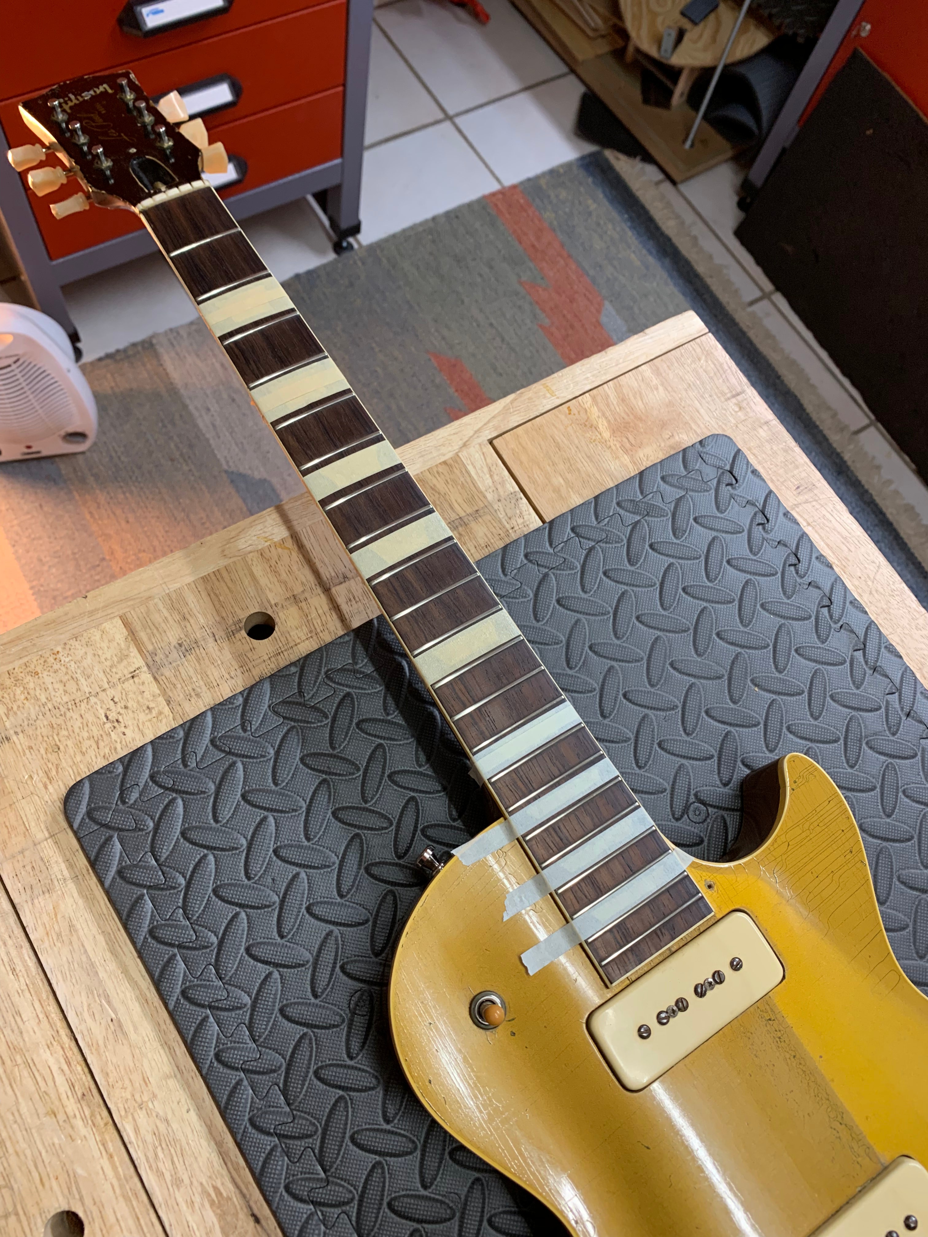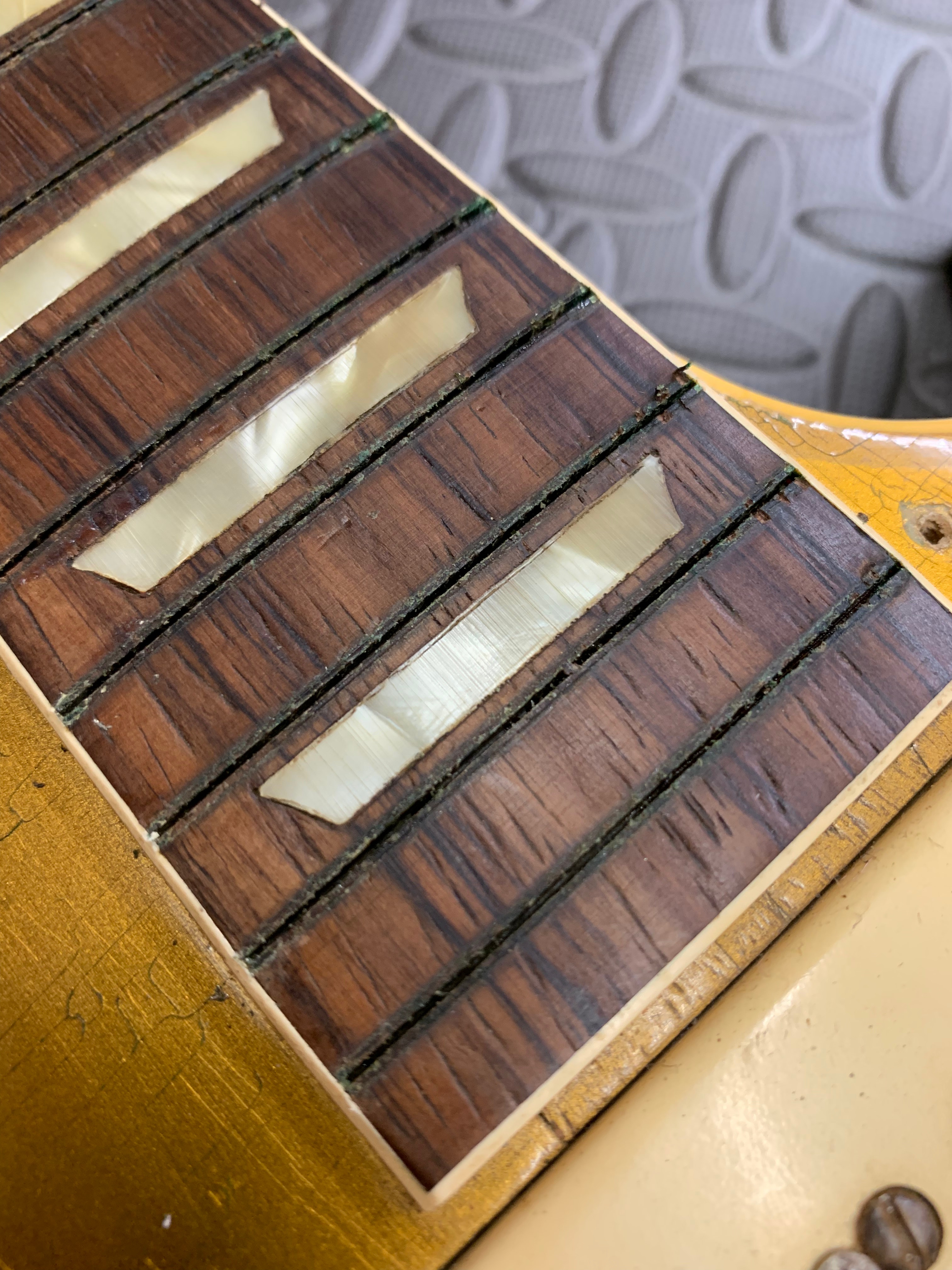 Hier einige Aufnahmen von der Neu-Bundierung. Sehr schön zu erkennen auch das unter den Artenschutz fallende Griffbrett aus Rio-Palisander. Mit dem originalen Kaufbeleg und einem entsprechenden Gutachten, konnte eine CITES-Vermarktungsbescheinigung beantragt und erteilt werden.