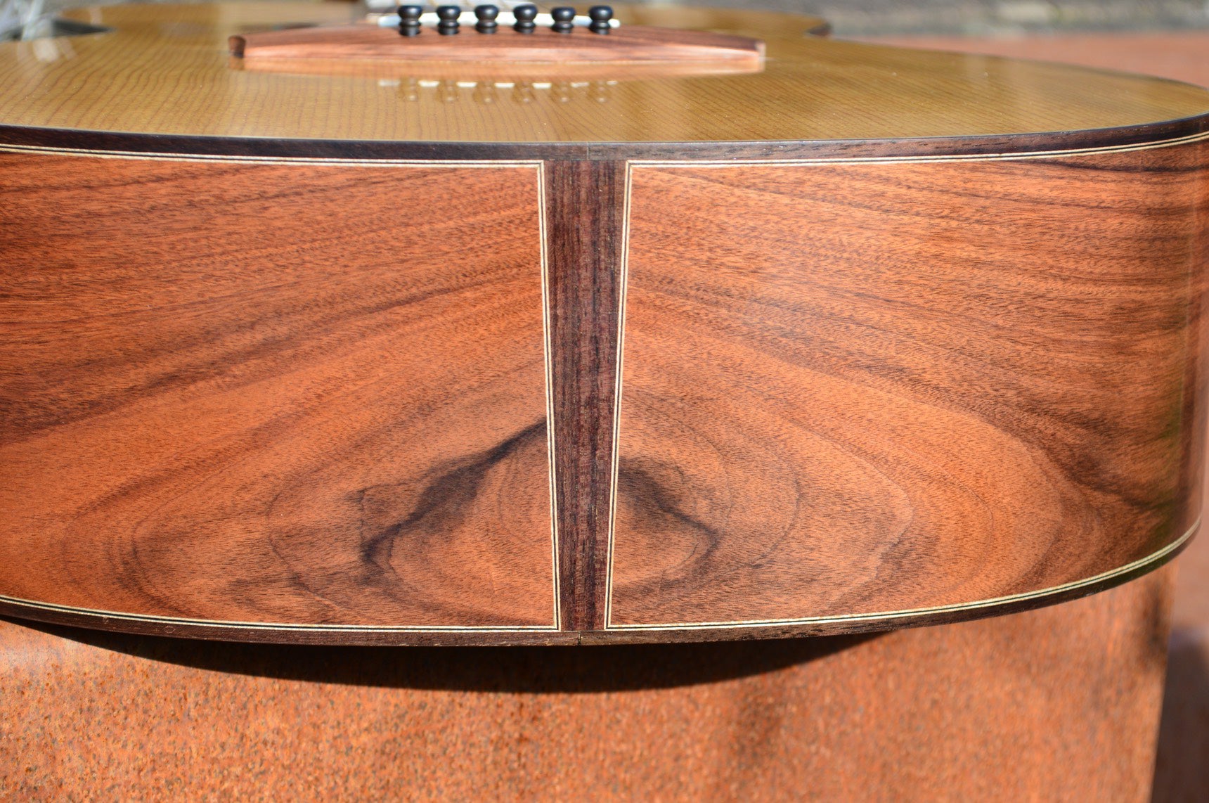Eine custom built OM/OOO mit extra tiefem Korpus von 118 auf 98 mm. Das Besondere hier ist zudem ein sogenannter Soundport - ein „Loch“ in der Zarge, durch das die Gitarre direkter und für das Ohr des Spielers offener und transparenter klingt. Der Hals wurde aus 40 Jahre altem Mahagoni gefertigt. Der Korpus, das Griffbrett, die Brücke und die Kopfplattenfurniere bestehen aus Pao Ferro. Die Decke ist aus „gebackener“ Fichte. Beim „backen“ wird das Holz unter Sauerstoffausschluss extrem erhitzt, sodass es normaler Weise verbrennen würde. Die Decke ist dadurch künstlich gealtert. Die Intarsien sind aus Perlmutt.
