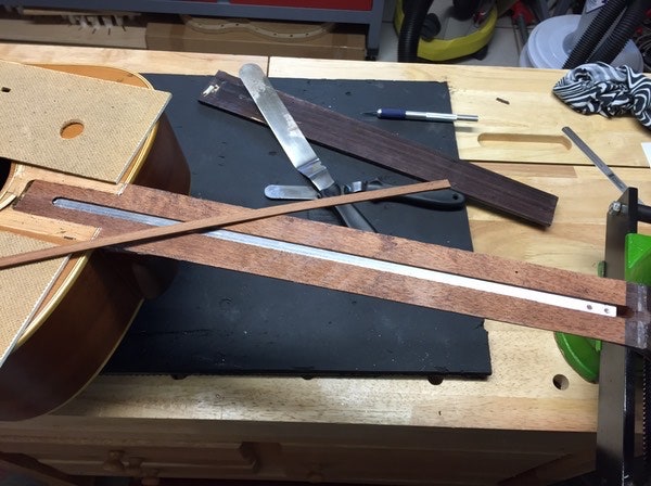 Zunächst wird das Griffbrett an den Flanken vom Lack befreit, der Sattel entfernt, Index-Löcher für das spätere Aufleimen des Griffbretts gebohrt und mittels Hitze - hier ein normales Bügeleisen - und Tortenmessern das Griffbrett entfernt. Anschließend wird der Spannstab ausgewechselt und das Griffbrett wieder aufgeleimt. Zum Schluß wurde die Gitarre neu bundiert.